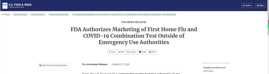 东方生物呼吸道三联检产品取得美国FDA De Novo认证