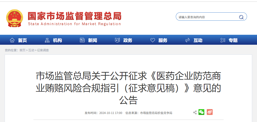 2024年10月11日,市场监管总局发布:关于公开征求《医药企业防范商业贿赂风险合规指引(征求意见稿)》意见的公告。