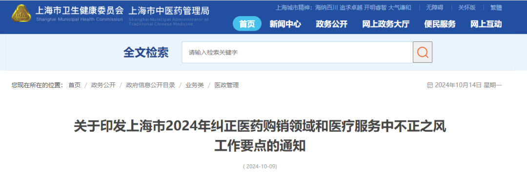 10月9日,上海市卫健委与其他13个部门联合印发《上海市2024年纠正医药购销领域和医疗服务中不正之风工作要点》,共包含5部分 18条内容 。