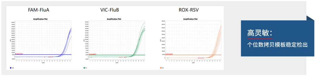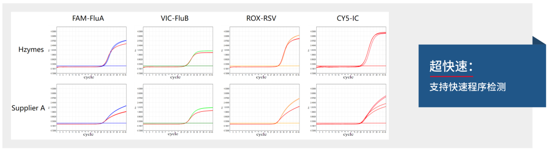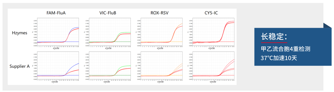 瀚海与竞品全预混试剂,在甲型流感病毒、乙型流感病毒、呼吸道合胞病毒混合检测项目中37℃加速10天检测结果(红色曲线为加速后曲线)
