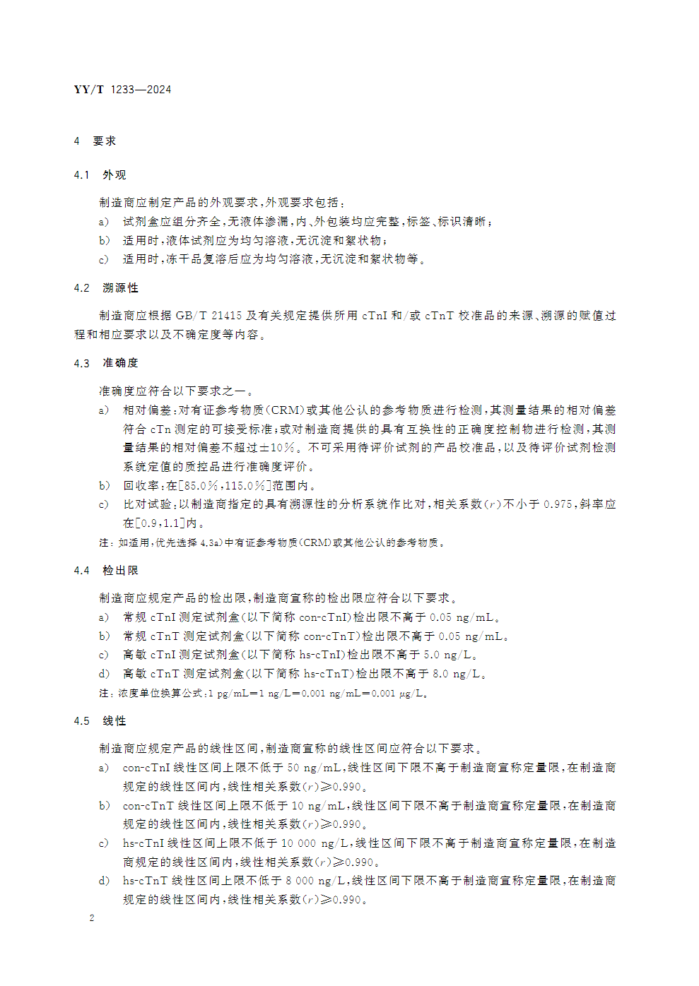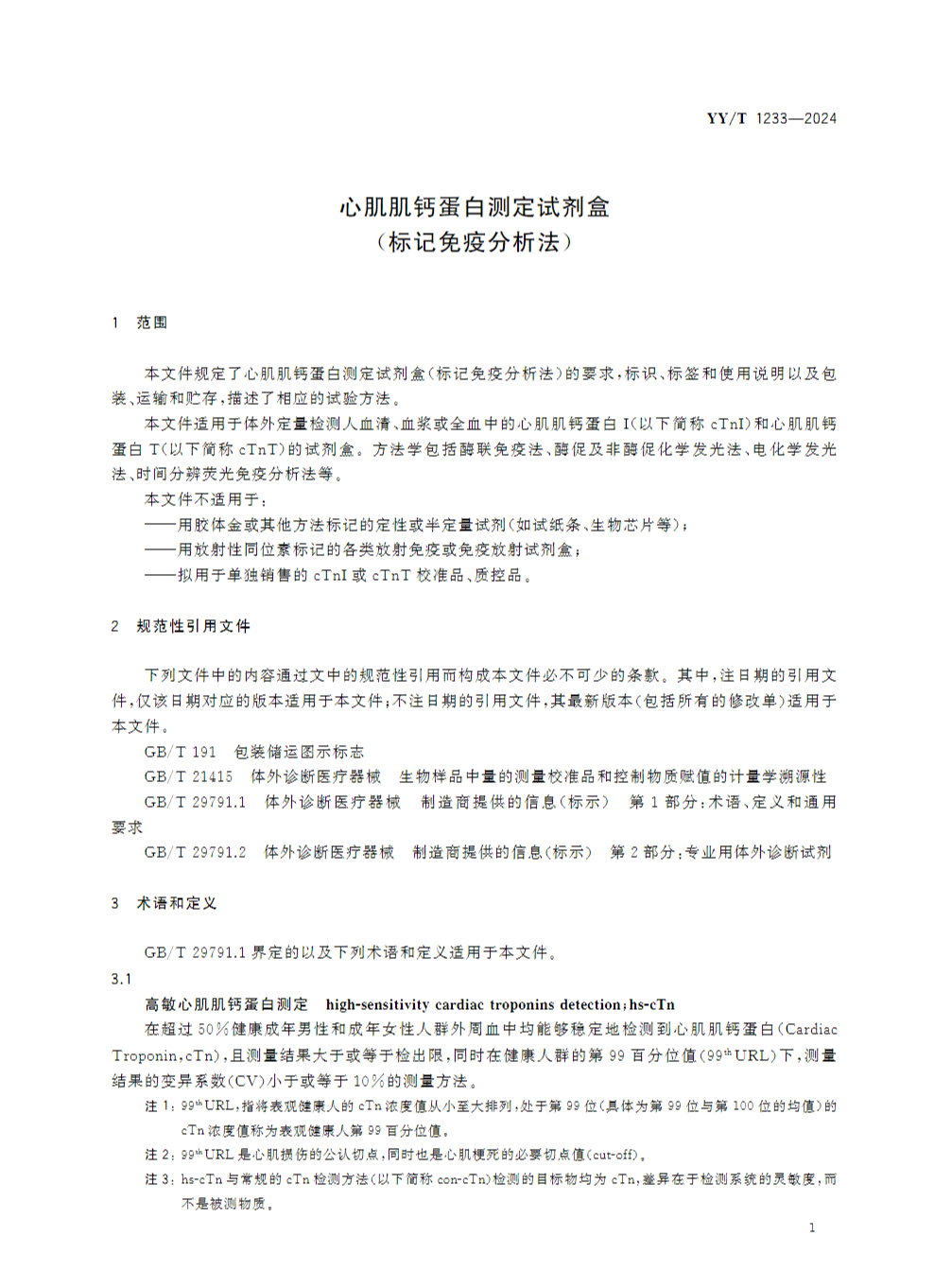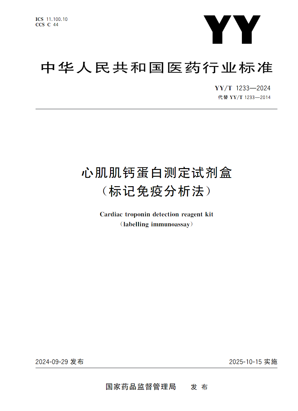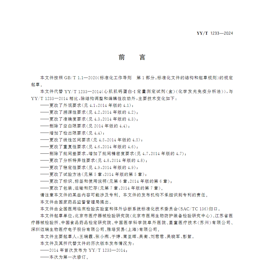 国家药监局发布行业标准《心肌肌钙蛋白测定试剂盒(标记免疫分析法)》YY/T 1233—2024,该标准将于2025年10月15日实施!